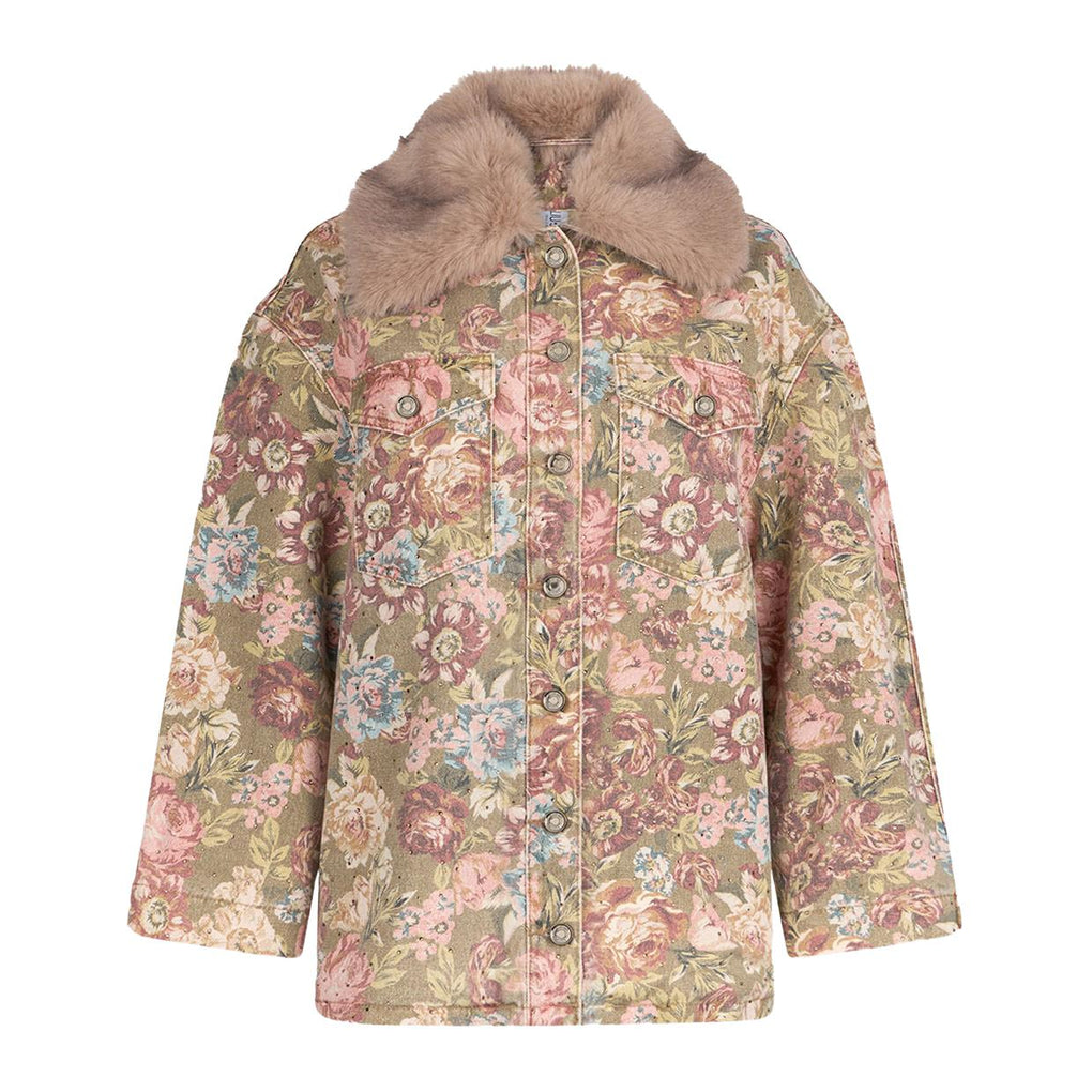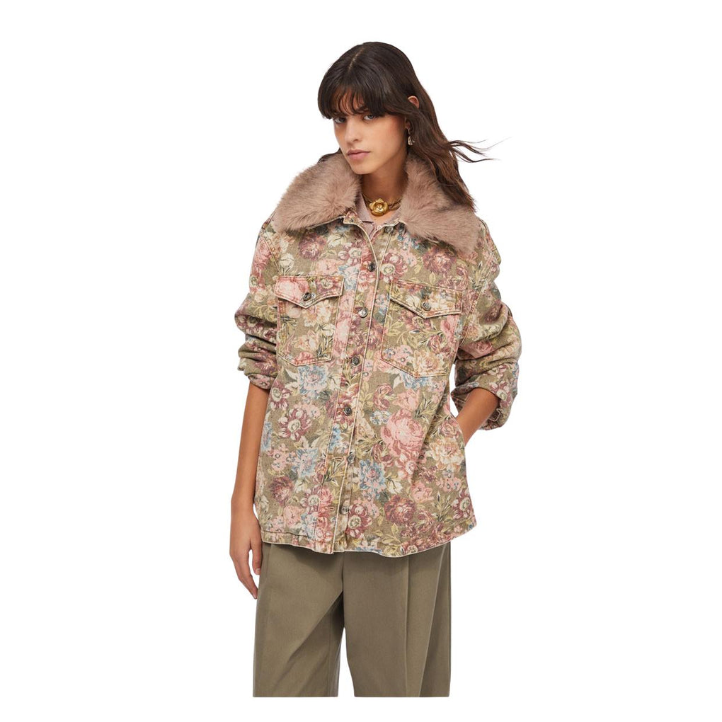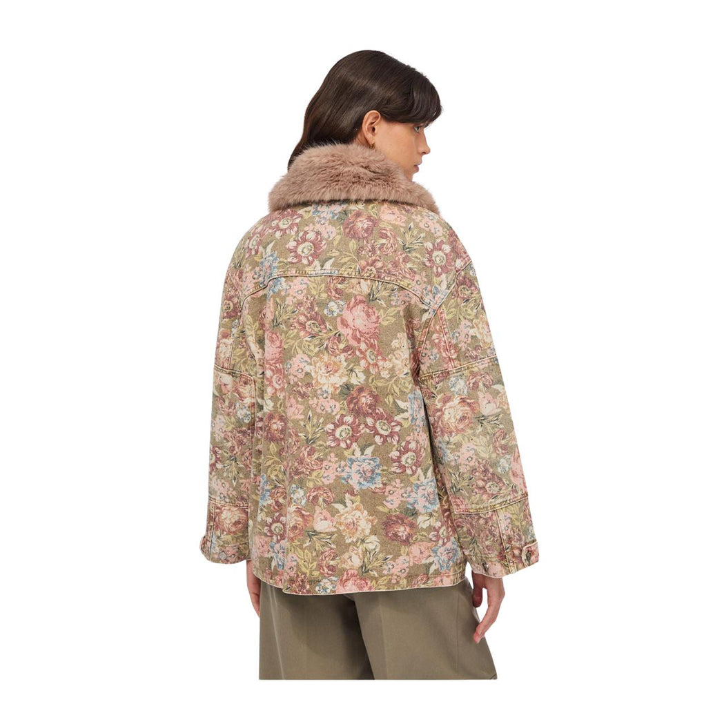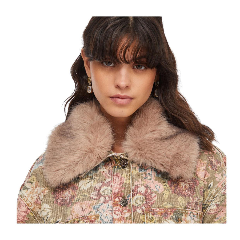 Il Giubbino Donna LIU-JO Western Over è realizzato in 100% cotone; fantasia allover stampato a fiori; maxi colletto removibile in pelliccia sintetica; due tasche sul petto con patta e bottoni; chiusura frontale con bottoni logati.