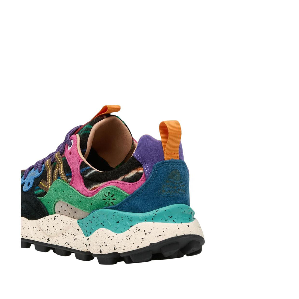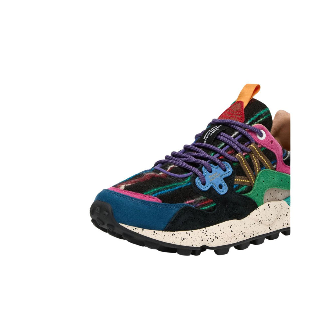 Le Sneakers Yamano 3 presentano una tomaia con costruzione overlapping realizzata in tessuto con tramatura multicolor verticale e dettagli in suede effetto color block; questo modello di ispirazione trekking con occhielli rinforzati è dotato di una soletta interna in sughero naturale antibatterico e poggia su un fondo in gomma ultraleggera con mescola bicolore e battistrada dentellato.