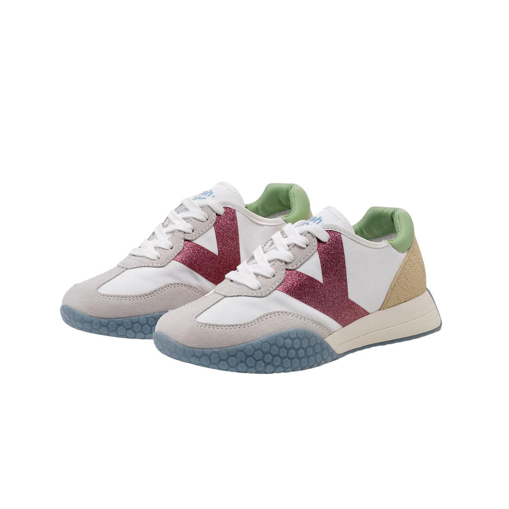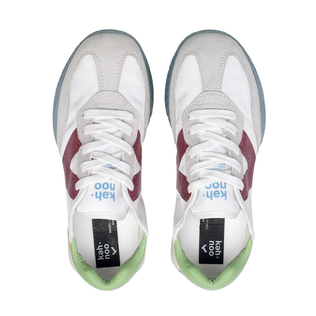 Le Sneakers Kehnoo KW 9312 presentano una tomaia realizzata in nylon, con inserti in suede sulla punta ed in gomma ( effetto pelle martellata ) sul tallone; questo modello è dotato di un'intersuola EVA, una soletta in schiuma rimovibile ed una suola in gomma con motivo esagonale.La scarpa è foderata internamente in French Terry ed è caratterizzata dal logo sul lato con effetto glitter.
