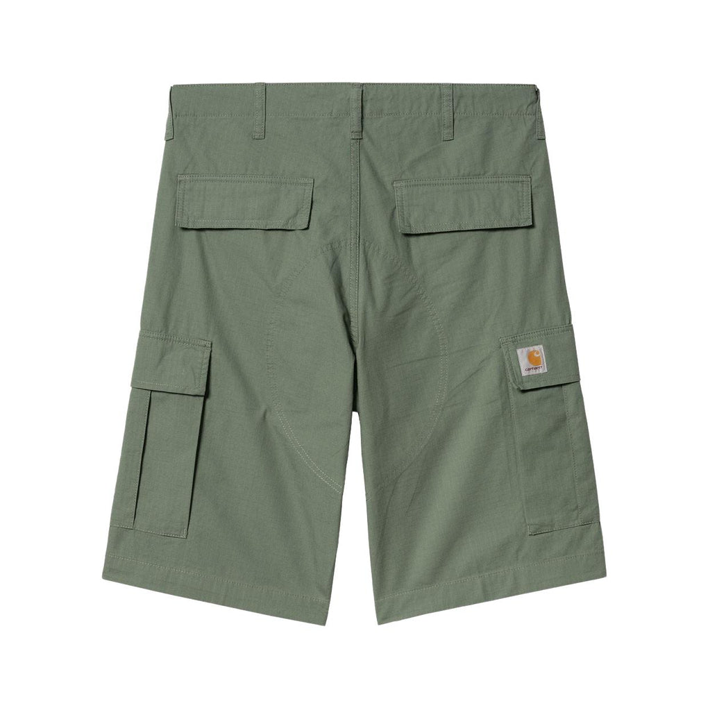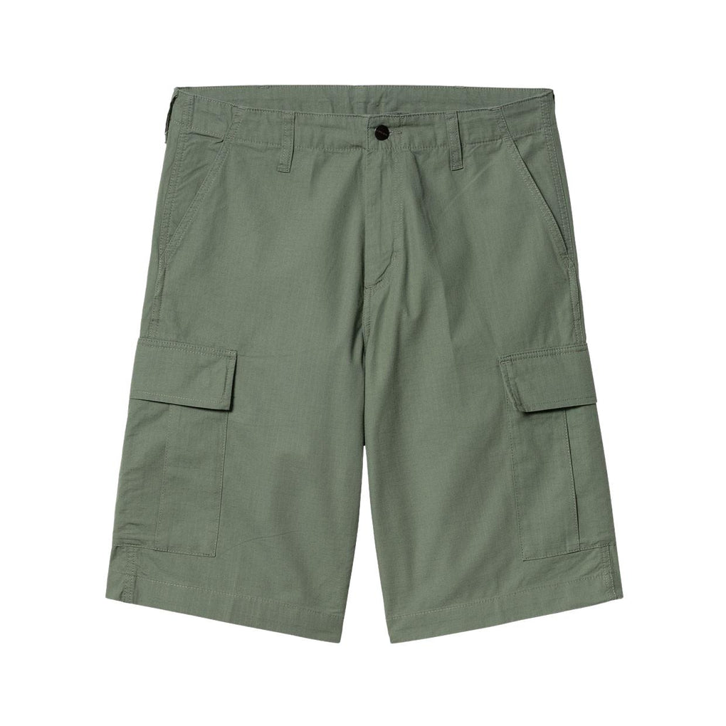 I0282461 Y F02 - Park (rinsed) I Bermuda Carhartt W I P Regular Cargo Short are made of 100% 'Columbia' ripstop cotton, with reinforced stitching at high-stress points; this model features a regular fit, numerous external pockets (including two side cargo pockets) and is characterized by the Carhartt label sewn on the right cargo pocket. Product details: 100% 'Columbia' ripstop cotton fabric, 6.5 oz Reinforced stitching Zip and button closure Two side welt pockets Two side cargo pockets Two back pockets Carhartt label sewn on the right cargo pocket