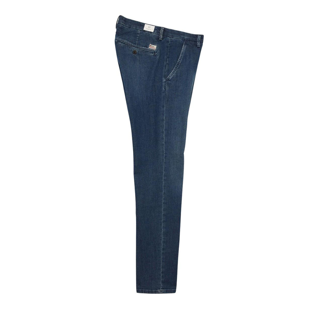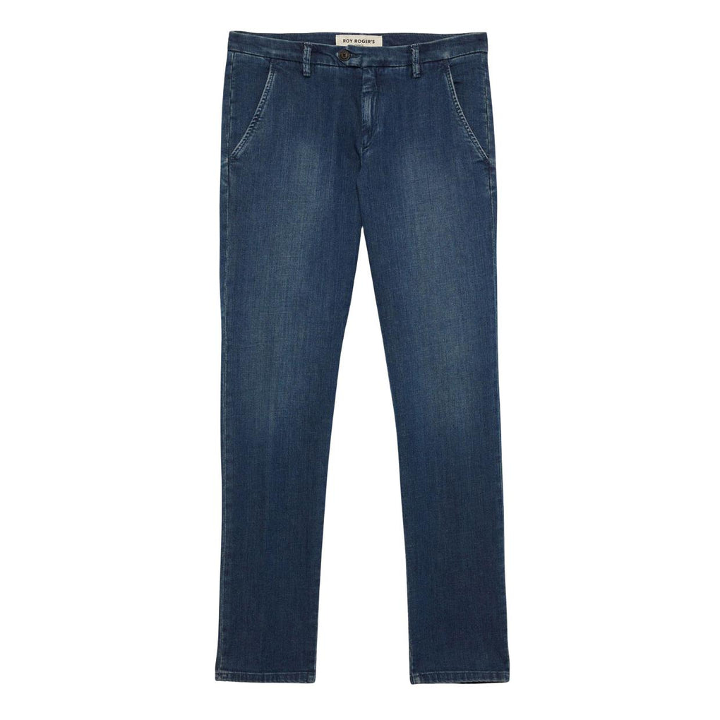 The Roy Roger's New Rolf Pants are made of stretch cotton denim, featuring a medium wash; this model has a slim fit, two front American-style pockets, and two welt pockets on the back.