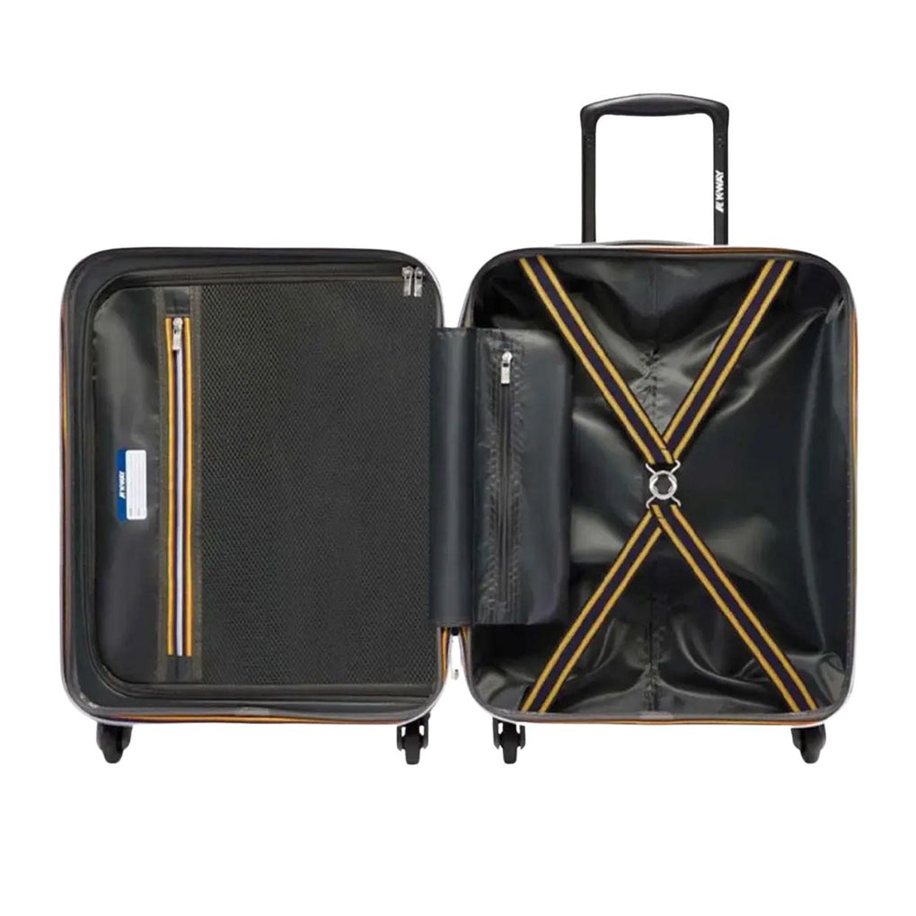 Il Trolley K-Way Medium è realizzato in ABS e foderato internamente in tessuto di poliestere, caratterizzato da una stampa logo K-Way; questo modello presenta tre scomparti con zip all'interno, un sistema di elastici incrociati multicolor e quattro ruote doppie girevoli a 360°, per garantire la massima libertà di movimento. La valigia è dotata di una maniglia estensibile in alluminio e di un sistema di chiusura con combinazione e TSA. Il logo K-Way è impresso in rilievo sul fronte. Misure: 56cm x 42cm x 24cm Codice: K11417W Colore: L23